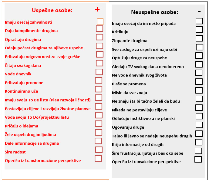 Akcioni plan: Napravite plan za izgradnju uspešne ličnosti tako što ćete sve iskaze koje imate obeležene – na strani neuspešnih promenom ponašanja vremenom zameniti sa adekvatnim iskazima sa strane uspešne ličnosti.
